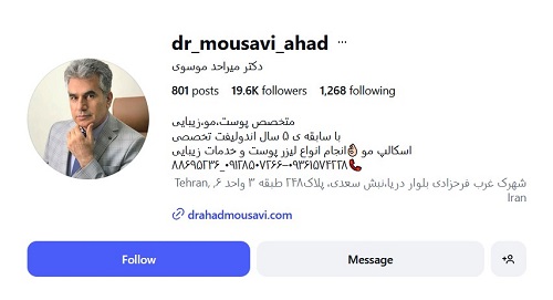 پوست، مو و زیباییدکتر میراحد موسوی، متخصص پوست، مو و زیبایی و عضو انجمن متخصصین پوست ایران، با بیش از ۲۰ سال سابقه در ارائه خدمات درمانی و زیبایی به بیماران سراسر کشور فعالیت میکنند. ایشان دارای مدرک پزشکی عمومی از دانشگاه علوم پزشکی تهران و بورد تخصصی پوست و مو از دانشگاه علوم پزشکی تبریز هستند و با تجربه و مهارت خود، خدماتی تخصصی و با کیفیت به مراجعین ارائه میدهند.